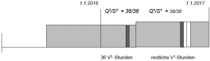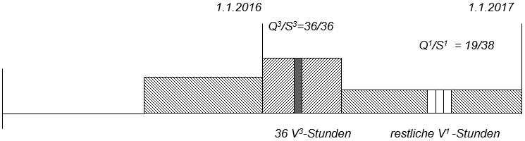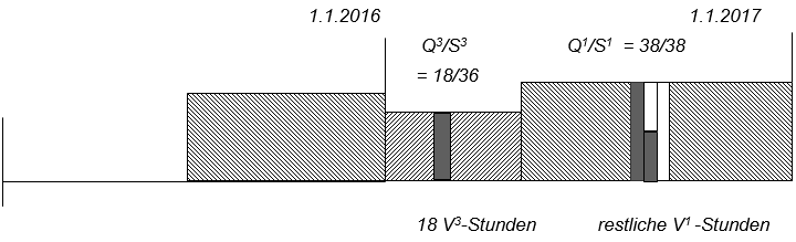 - Anzahl restlicher bezahlter V1-Stunden = (J x S1/6)– (V3-Stunden x S1/S3) = [(12 x 38/6) – (36 x 38/36)] = 38 St.