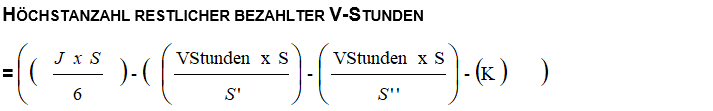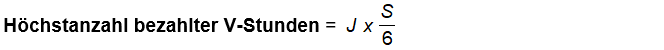 - Höchstanzahl restlicher bezahlter V-Stunden = (J x S1/6) – (V2-Stunden x S1/S2) = [(10 x 38/6) – (43 x 38/35)] = 16,65 St.