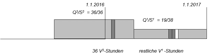 - Anzahl restlicher bezahlter V1-Stunden = (J x S1/6) – (V3-Stunden x S1/S3) = [(12 x 38/6) – (36 x 38/36)] = 38 St.